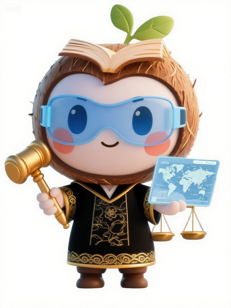 “法小椰”身着黑色法学袍,袍身饰有金色法典纹路与国际航海航线图,袖口与下摆以金色浪花镶边,体现法学庄严与海洋文化的交融。腰间系着蓝色海浪丝带,更添灵动。脚穿浅棕色短靴,靴筒饰以金色浪花滚边,靴底刻有发光的波浪纹路,仿佛踏浪而行,展现前行动感与海洋文化的融合。除此之外,值得注意的是它手中的道具也富含深意。左手握法槌,象征公平与正义;右手托举全息投影器,展示世界地图,呼应国际化与数字化的新时代法学视野。