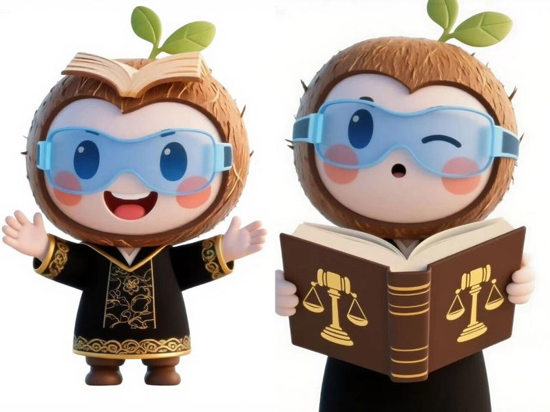 “法小椰”头型圆润可爱,棕色的椰壳保留天然纹理,正面融入法典书页的白色纹路,彰显法律的核心地位。头顶两片绿意盎然的椰叶,象征着扎根海南、茁壮成长,寓意着不断生长的希望。同时,在面部的设计上也做到了极具亲和力,一双如南海般清澈的蓝色大眼睛,眼神聪慧明亮,搭配微笑表情和淡淡红晕,拉近与大家的距离。