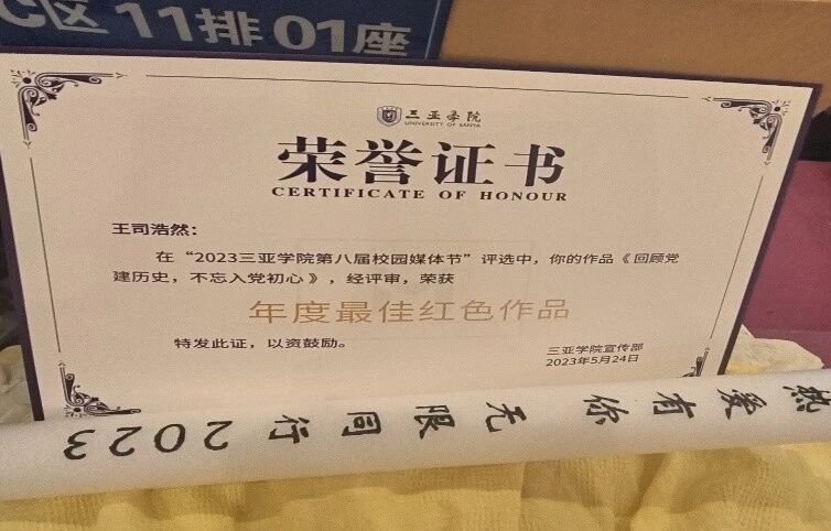 2023年三亚学院第八届校园媒体节获得“年度最佳红色作品”。