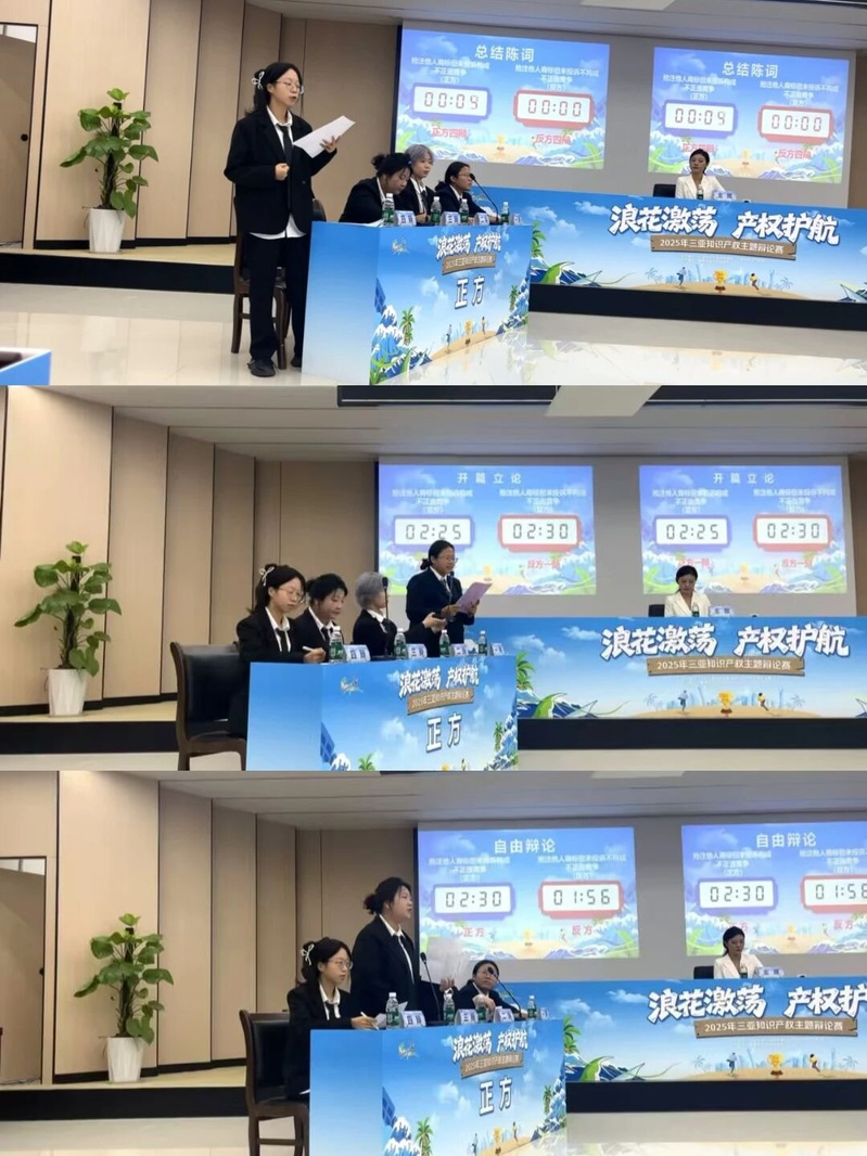 随着赛事的火热进行,三亚学院法学院辩论队也顺利来到半决赛。2025年10月10日上午,三亚知识产权主题辩论赛半决赛在三亚市市场监督管理局举行。法学院(自贸港国际法学院)(以下简称“我院”)派出李茜、王逸宁、高卓、李晨雨、路俏然参赛。此次半决赛的辩题为抢注他人商标但未投诉是否构成不正当竞争。我院辩论队持正方观点与反方肄言辩论队展开一场逻辑严密、观点交锋激烈的精彩对决。
