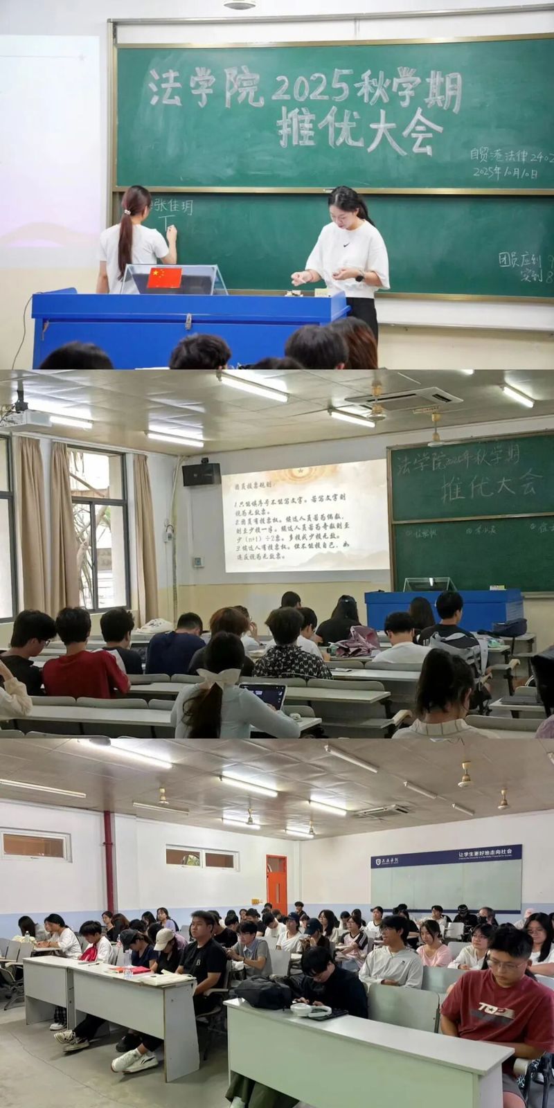 为严格落实党员发展工作要求,切实把政治素质硬、思想觉悟高、综合表现优的青年学生选拔出来,为党组织注入新鲜血液,近日,法学院(自贸港国际法学院)(以下简称“我院”)召开入党推优大会。本次大会参与人员共2024级五个班级。