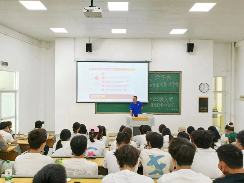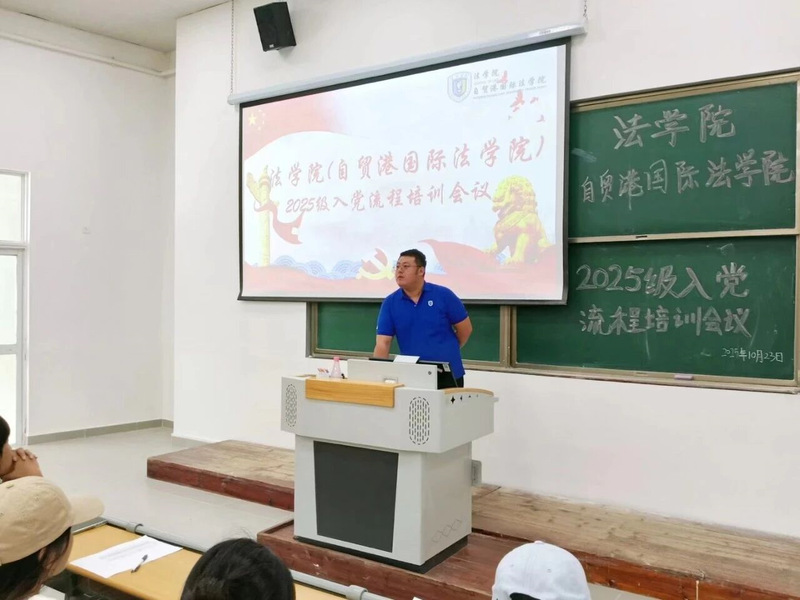 为进一步规范党员发展工作,帮助同学了解入党流程,加强学生入党意识,法学院(自贸港国际法学院)(以下简称“我院”)近期在书德楼组织开展了2025级入党流程培训会议。会议由团委副书记曹添主讲,团委组织部以及25级学生共同参会听讲。