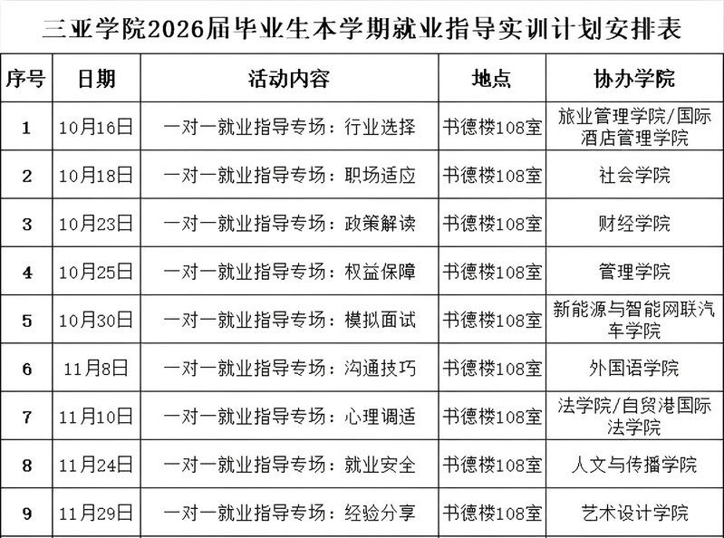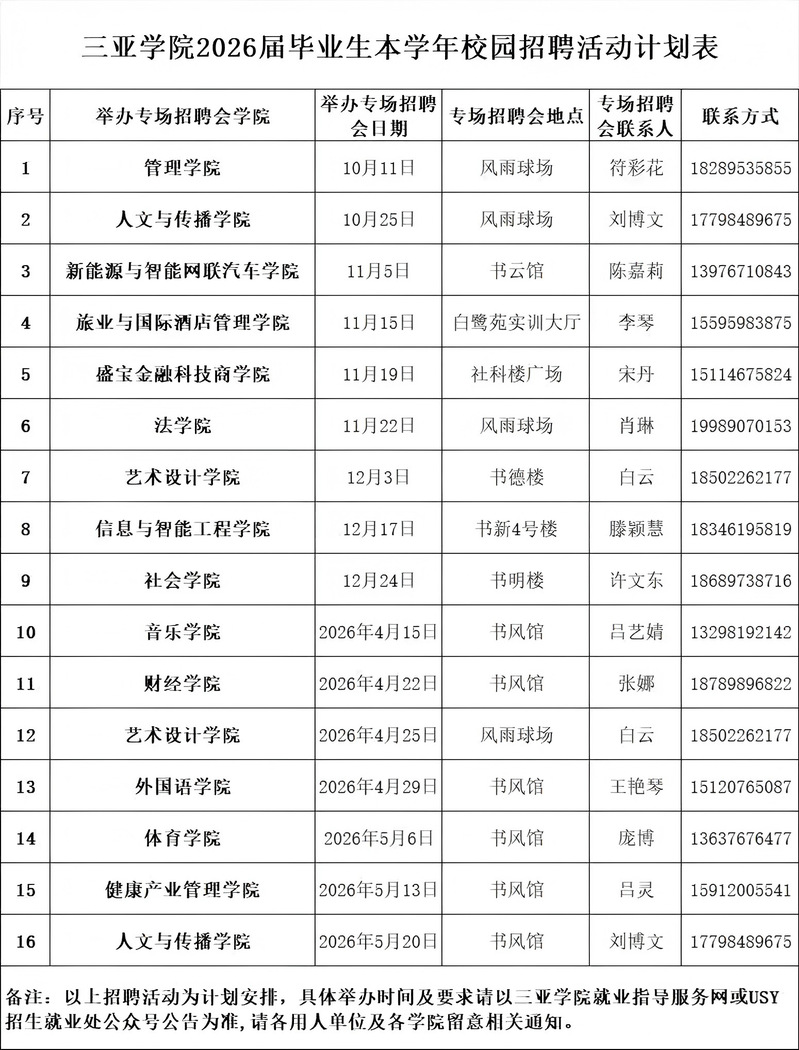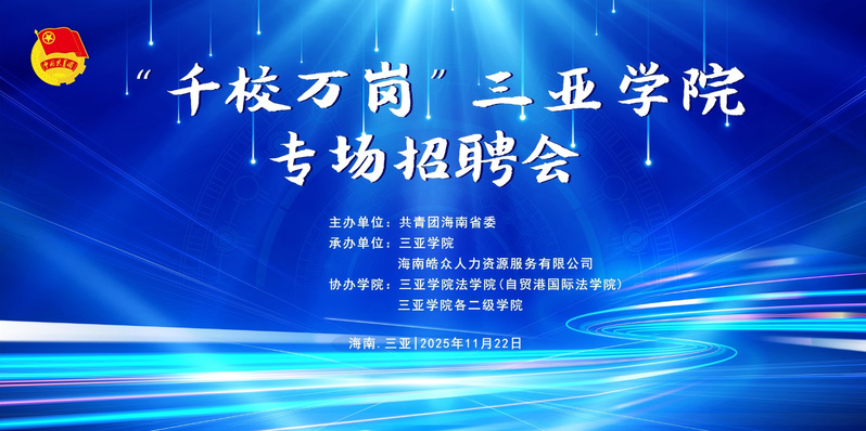 为深入贯彻落实国家和海南省关于做好高校毕业生就业工作的重要决策部署,积极拓展就业渠道,我校将于2025年11月22日(周六)在三亚学院风雨球场举办秋季学期第六场校园招聘会。本次招聘会作为我省“海南学子 就在海南”留才行动的重要内容,将为广大毕业生和用人单位提供双向选择的平台,现向您发出诚挚邀请,期待您的到来。