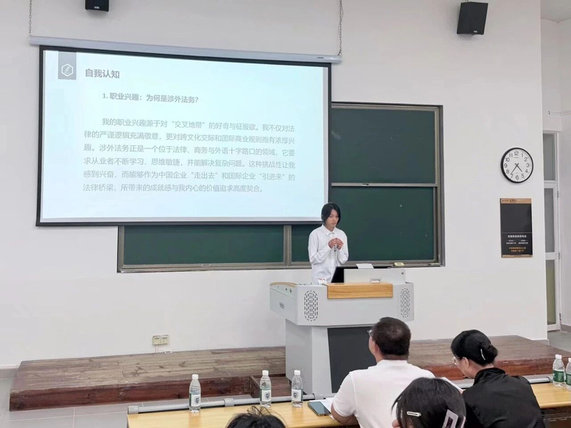比赛开始后选手们依次登台,通过个人展示与现场答辩两个环节,向评委和观众描绘了各自精彩的法治人生图纸。成长赛道的选手们通过剖析自我兴趣与能力,结合对自贸港法治需求的宏观理解,描绘出清晰的学业蓝图与职业发展路径。他们的展示充满了探索精神,展现了从“法学新人”到“国际法律人才”的成长潜力。职业赛道的选手们则具备明确的职业目标,他们的规划书包含了具体的实习计划、专业证书考取路径,展现了高度的专业性与职业成熟度。