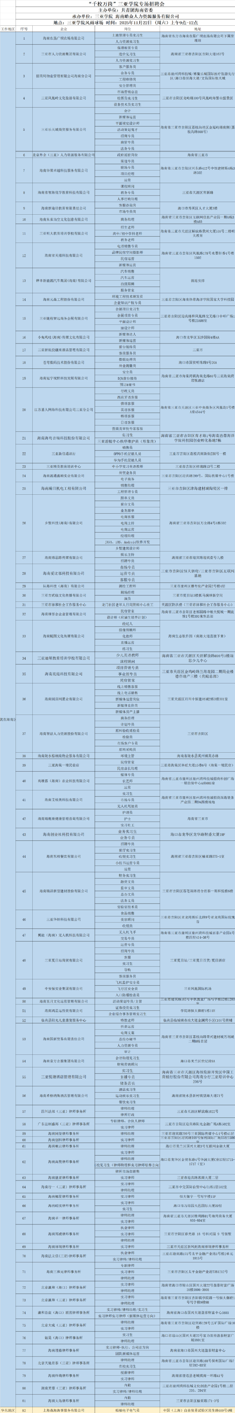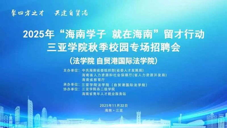 为深入贯彻落实国家和海南省关于做好高校毕业生就业工作的重要决策部署,积极拓展就业渠道,法学院(自贸港国际法学院)(以下简称“我院”)将于2025年11月22日(周六)在三亚学院风雨球场隆重举办秋季学期第六场校园招聘会暨首届“就业嘉年华”。本次活动作为我省“海南学子 就在海南”留才行动的重要内容,将以“嘉年华”的开放、多元与互动氛围,为各类专业学子与优质企业搭建高效、精准的双向选择平台。