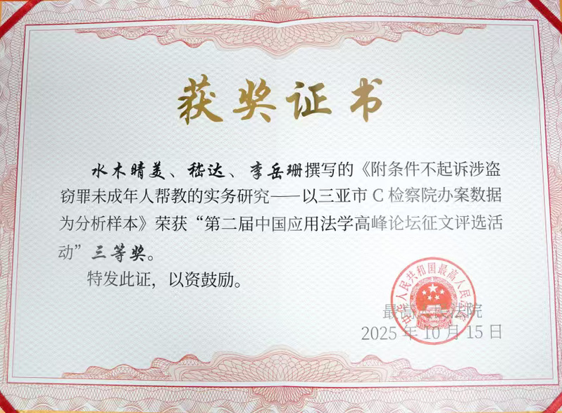 近日,最高人民法院第二届中国应用法学高峰论坛征文评选结果公布,三亚学院水木晴美老师携手嵇达(2022 法学专业本科毕业、2025 届社会工作(司法社工方向)研究生)、李岳珊(海南省万宁市人民检察院检察官、2016 届法学(海商法)毕业生)共同撰写的论文《附条件不起诉涉盗窃罪未成年人帮教的实务研究 —— 以三亚市 C 检察院办案数据为分析样本》荣获三等奖。