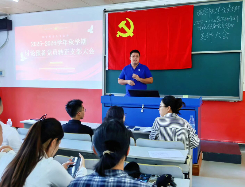 为进一步加强新时代党员队伍建设,优化队伍结构、提升整体素质,吸收更多先进分子加入党组织,2025年12月17日,法学院(自贸港国际法学院)在书明楼B303召开2025-2026学年秋季学期预备党员转正支部大会。学院学生党支部书记曹添,思想导师刘悦、董津语、肖琳、史钊堃、潭孝明、羊侯锦以及全体正式党员、预备党员参加会议。此次大会有效优化了学院党员队伍结构,进一步增强了基层党组织的生机与战斗力。