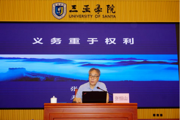 2025年12月28日上午,三亚学院书山馆二楼中报告厅报告厅内掌声阵阵、座无虚席。第四届廉政法治论坛重要嘉宾、中国行为法学会副会长兼学术委员会主任、中共中央党校政法部原主任、一级教授、法学博士张恒山开启专题学术交流,聚焦“义务重于权利”主题,为三亚学院师生献上一场兼具理论深度与实践价值的思想盛宴。此次讲座既是廉政法治论坛学术成果的延伸深化,也是三亚学院法学院(自贸港国际法学院)汇聚优质法学资源、强化特色学科建设的重要举措。