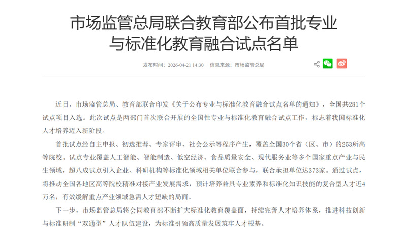 近日,国家市场监督管理总局、教育部联合公布首批专业与标准化教育融合试点名单,三亚学院专业与标准化教育融合试点成功获批立项。本项目由三亚学院牵头、三亚市市场监督管理局联合申报、海南省市场监督管理局与海南省教育厅共同推荐,实施周期四年,采用公共教育+专业教育+多类型学位融合培养模式,是全国民办高校、海南自贸港法学领域首个国家级标准化教育融合试点。