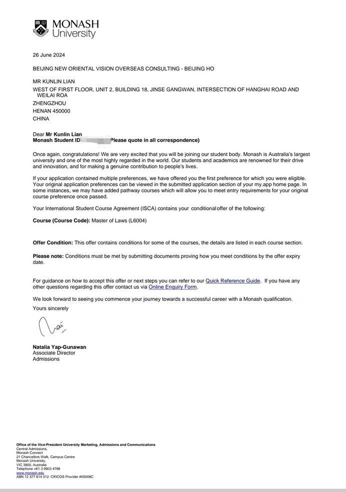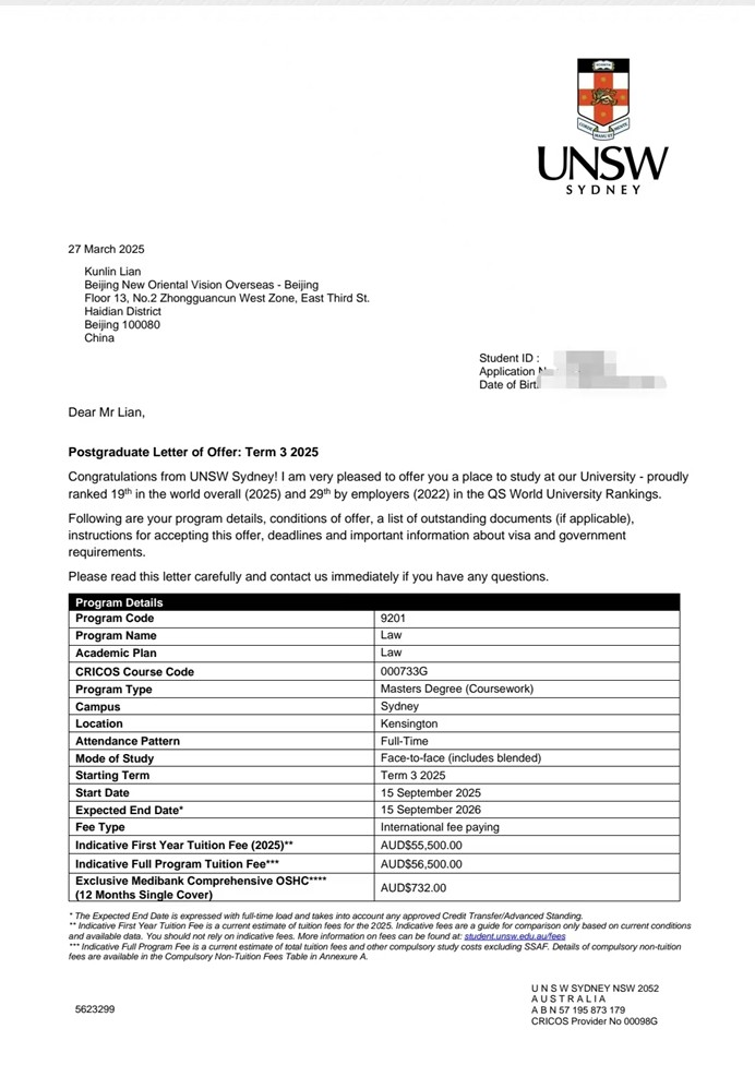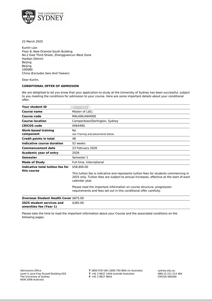 因律师行业高要求与其自身英语成绩优异,廉坤霖为申请更高层次国外院校决定出国深造。此后,其寒暑假及周末均投入雅思备考与实习,最终以7分成绩通过雅思考试,收获悉尼大学、新南威尔士大学、蒙纳士大学及7所英国院校录取通知。