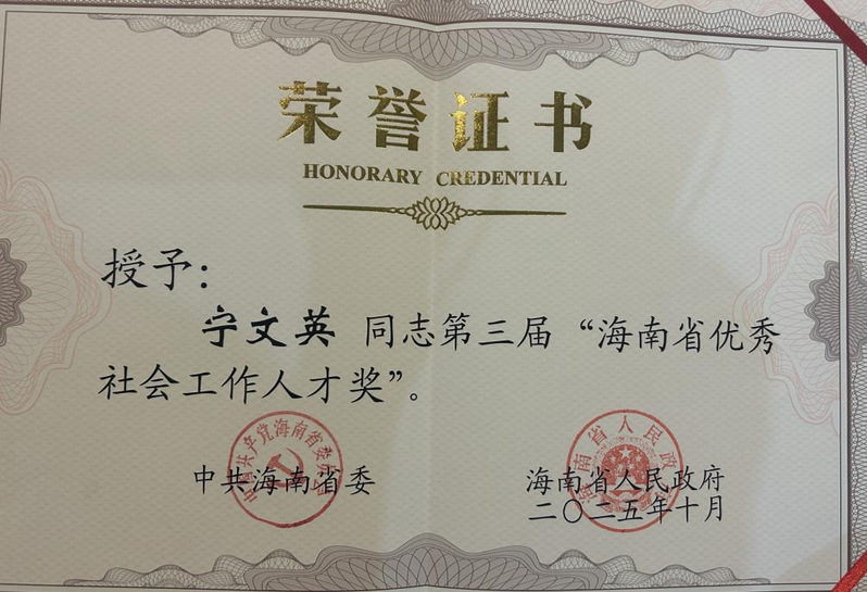在第三届海南省优秀社会工作人才奖颁奖仪式上,社会治理学院2014级社会工作专业校友宁文英荣获“第三届海南省优秀社会工作人才奖”。她在琼海市社会工作一线深耕十载,以专业能力与坚定信念守护在地新生代成长。该奖项既是对她个人贡献的高度认可,也体现了社会各界对三亚学院社会治理学院人才培养质量的充分肯定。